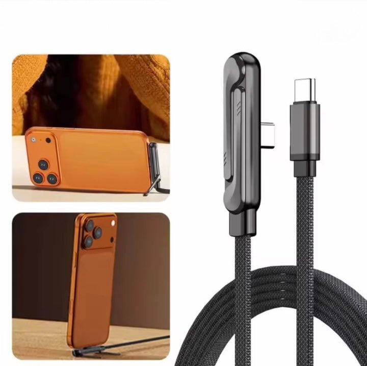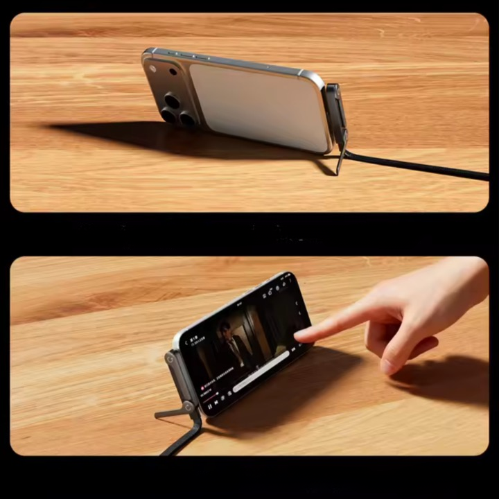 Kabeln har ett fällbart stativ inbyggt, vilket gör att du enkelt kan ställa upp mobilen vertikalt eller horisontellt för hands-free-användning medan den laddas.